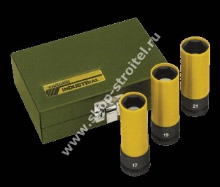 Головки рассчитаны на размеры 17, 19 и 21 мм и имеют длину 85 мм. Все детали набора хранятся в прочном стальном ящике.